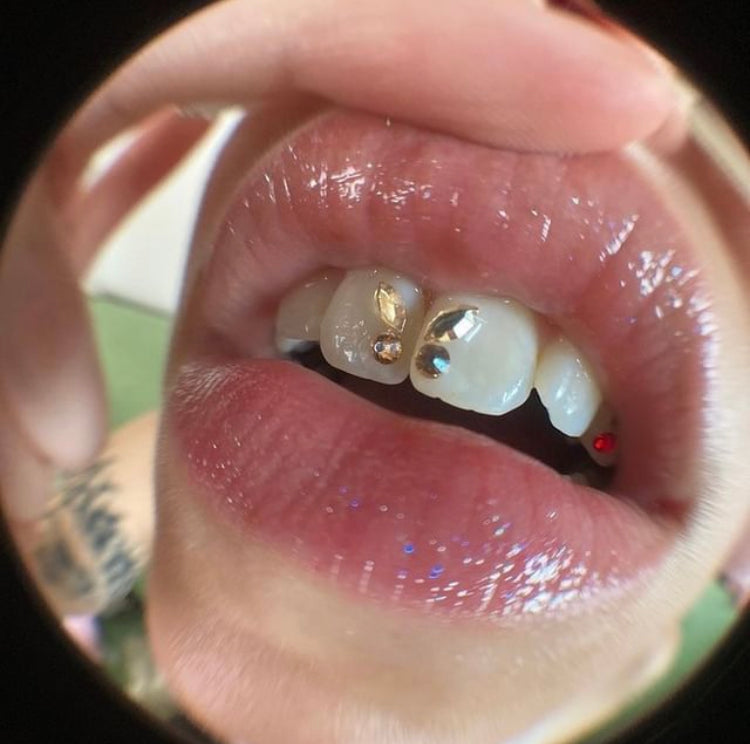 Apply – Add a small amount of dental-grade adhesive and place the gem